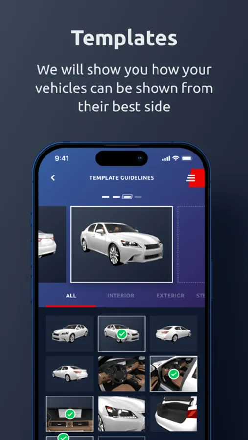 GAD24 App has intuitive interface throughout the whole process of making and processing photos. Such features as guidelines, levels, and skeletons help you find the best angle and position when taking photos while AI technology takes care of photos processing. The AI processes images by cutting out the vehicle from original photo and pasting it on the preselected background; this helps you avoid manual work and saves time.