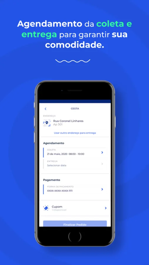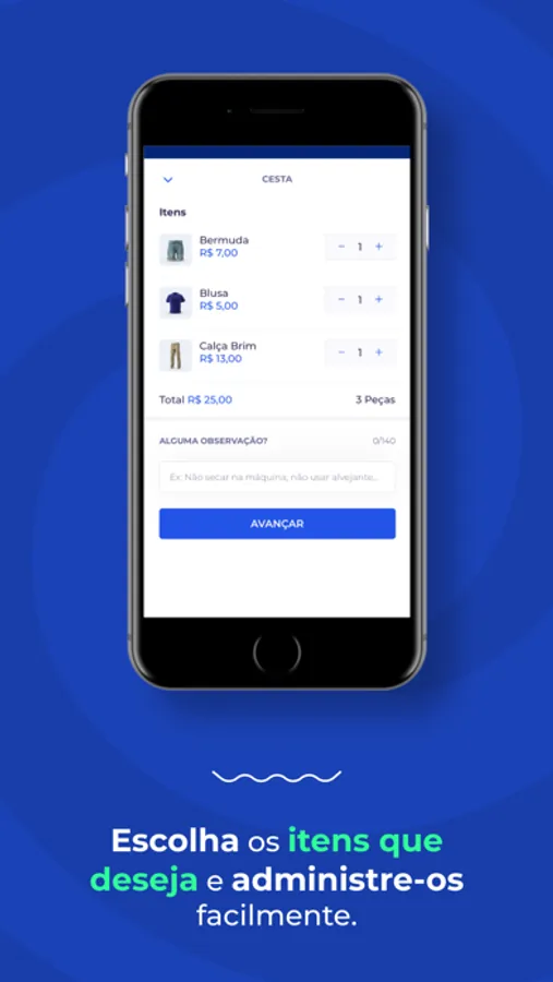 Adicione as peças de roupa na cesta, agende a coleta e a entrega, realize o pagamento pelo app e pronto, nós faremos o restante pra você. Lavvi é a maneira mais fácil, rápida e prática de lavar e passar as suas roupas.