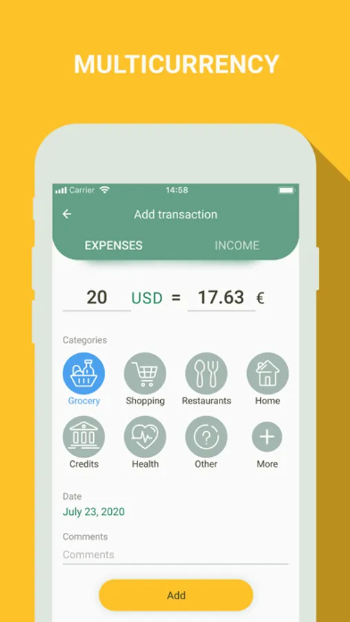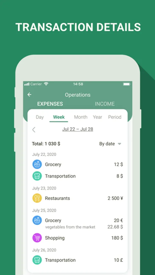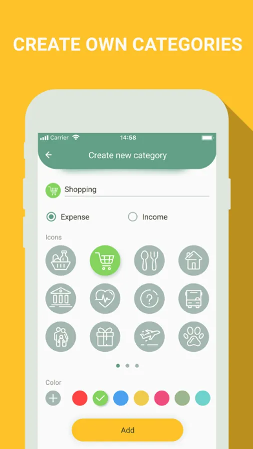Use ready templates (such expenses as grocery, hobby, utility bills, etc.) or create your own categories, choose any colors and entitle them to adjust the app as you see fit and get the most out of it;