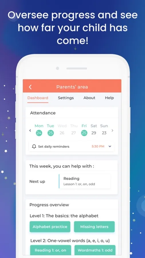 Our App uses market-leading technology and speech recognition to create an intuitive learning experience that is aware of your child's progress. GoLexic reading and spelling exercises are easy to understand and are shown at the right time.
