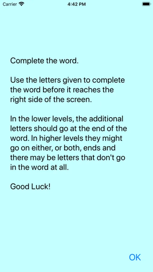 Part of a word will float across the screen. You are to complete the word before it reaches the other side. You will be given the letters you need but as you move up levels the letters may go on either end and even some letters you don't need may show up.