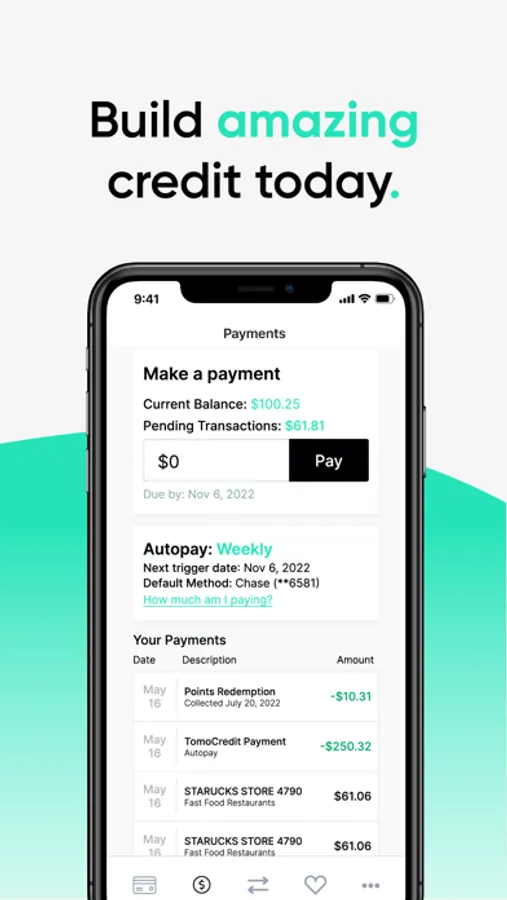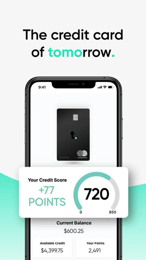Using the Tomo Card app, you can monitor your credit score, manage your card, view your transactions, make payments, redeem points, and more.