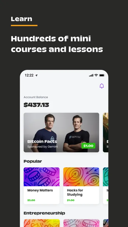 Learn & Earn is an app for students to learn financial literacy, work readiness, and entrepreneurship through bite-size courses. By completing courses, students unlock money contributed by sponsors and parents/guardians that’s invested into the real stock market - ETFs and fractional shares.