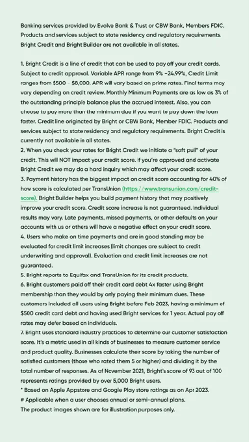 (2)Payment history has the biggest impact on credit score accounting for 40% of how score is calculated per TransUnion (https://www.transunion.com/credit-score). Bright Builder helps you build a payment history that may positively improve your credit score. A credit score increase is not guaranteed. Individual results may vary. Late payments, missed payments, or other defaults on your accounts with us or others will have a negatively affecting your credit score. Products and services are subject to state residency and regulatory requirements. Bright Builder is currently not available in all states.