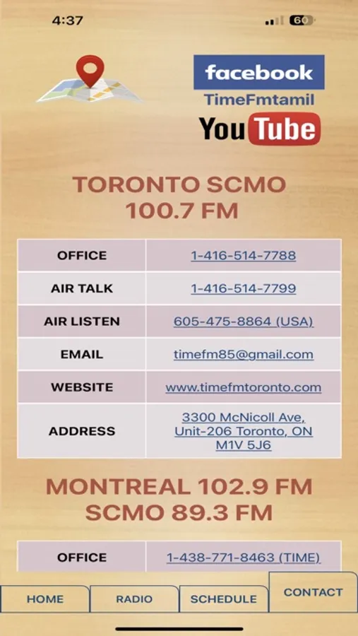 TimeFM is a Tamil Radio currently broadcasting in Montreal and Toronto. TimeFM is the ONLY Tamil Radio broadcasting in Montreal. You can use the TimeFM App to listen to our broadcast live on Montreal's 102.9 FM & SCMO 89.3 FM and on Toronto's SCMO 100.7 FM. Our mission is to spread the love we have for our culture and put together the building blocks for the next generation. We have multitudes of dynamic shows on our radio to keep our community up-to-date on worldwide incidents while giving full enjoyment to our increasingly expanding audience. This app contains the weekly schedule of our shows and contact information to reach us. You will also be able to see the whole TimeFM Team in this app with the different shows each TimeFM member hosts.