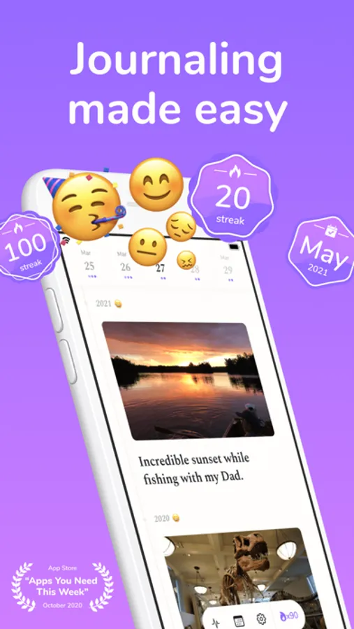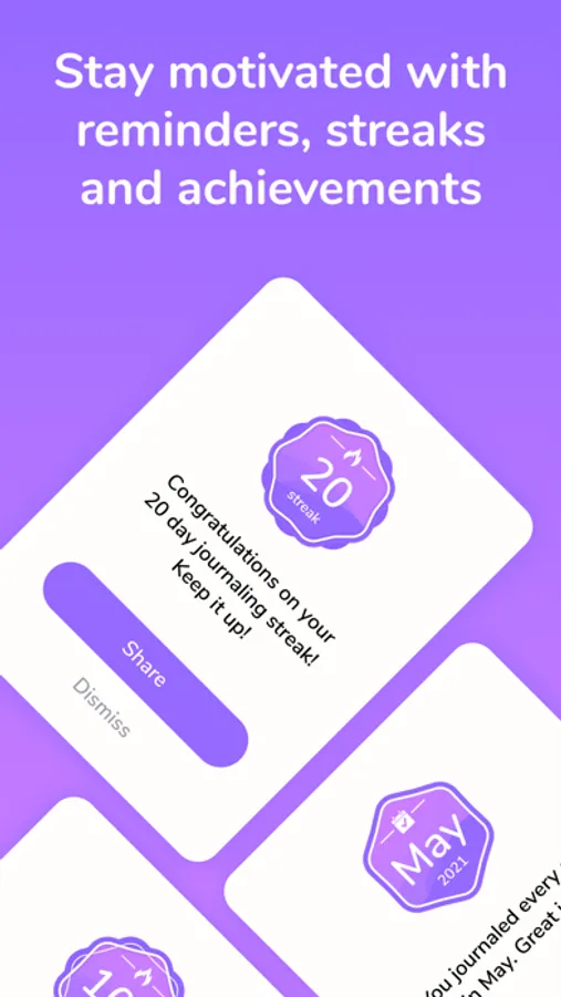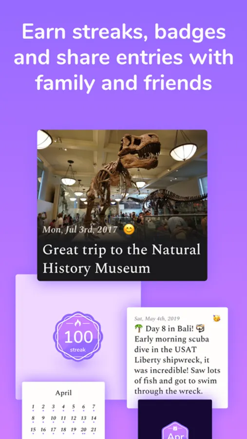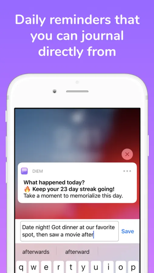 Diem helps you stay motivated with reminders, streaks and badges. Share them or beautifully formatted journal entries with friends and family.