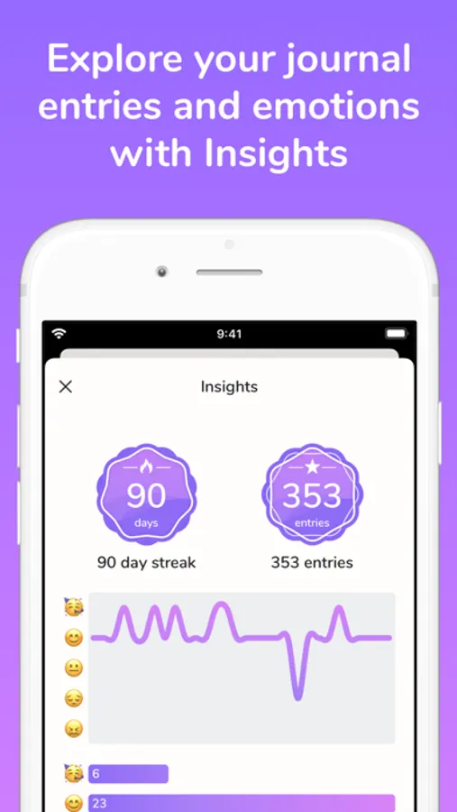 Diem helps to illuminate powerful insights into your thoughts and emotions. See how you’ve been feeling over the past 7, 30, 90 days, the past year or all time. Diem also uses advanced machine learning and natural language processing to help you explore the most common words and topics from your journal entries.