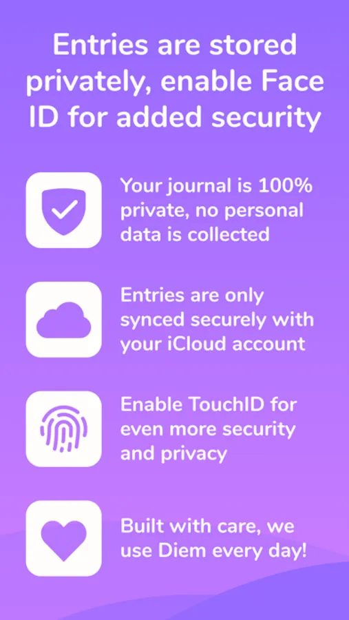 Security and privacy are very important to us. Diem does not share your personal information or journal entries in any way. Your data is only backed up to your Apple iCloud account for safe keeping and syncing to all your devices.