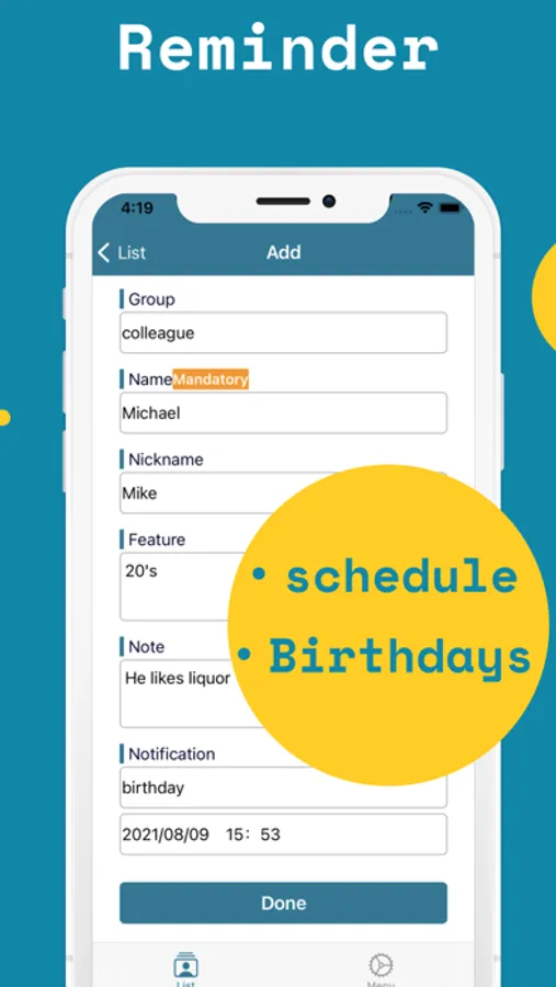 [Name], [Kana], [Features], [Memo], [Notification content], [Notification time]