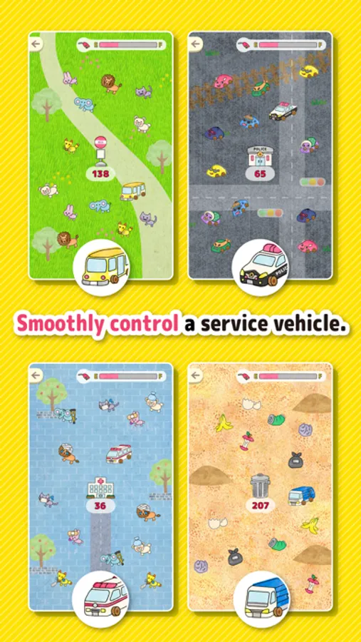 *Control four types of service vehicles (police car, bus, ambulance, and garbage truck) and chase moving targets.