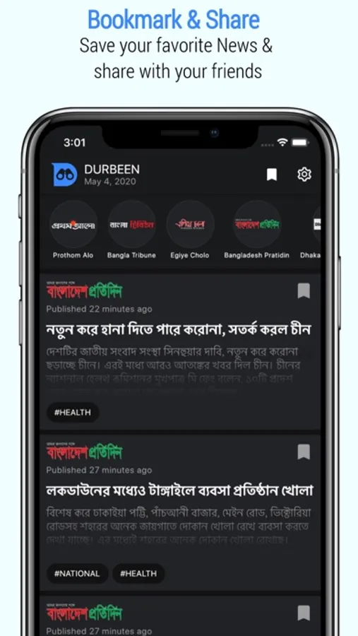 Durbeen provides news from the leading sources including Prothom Alo, Samakal, Bangladesh Pratidin, Egiye Cholo, Dhaka Tribune, Daily Star, Jugantor, The Independent etc. More are coming.