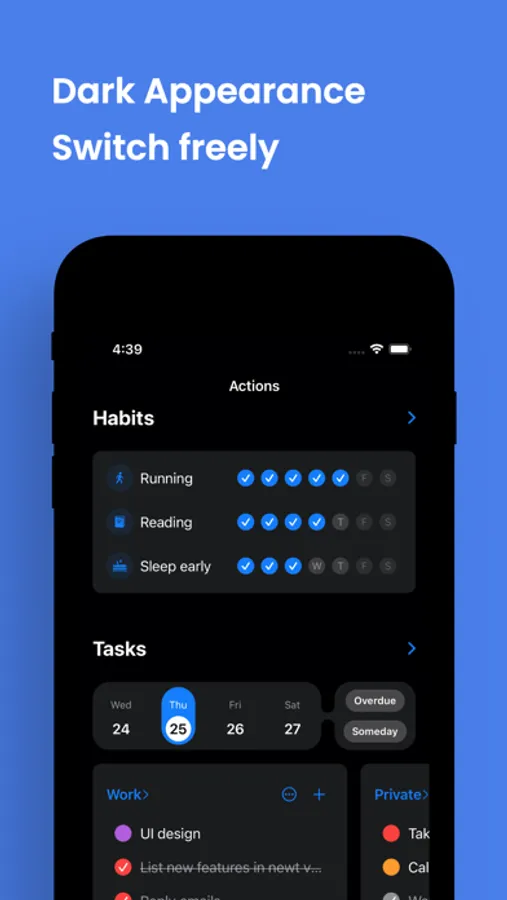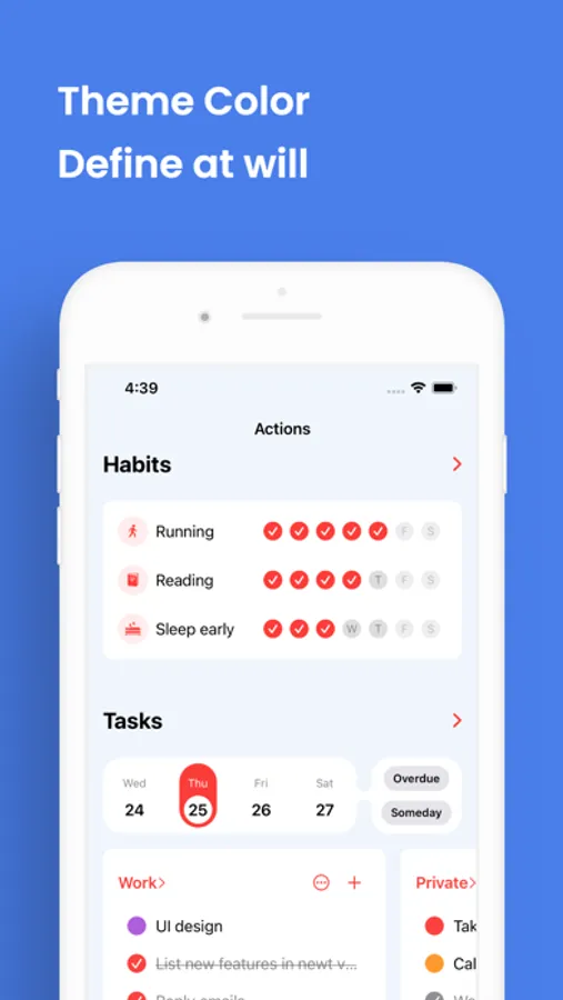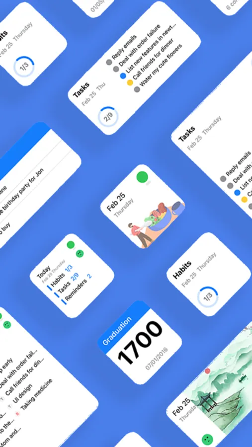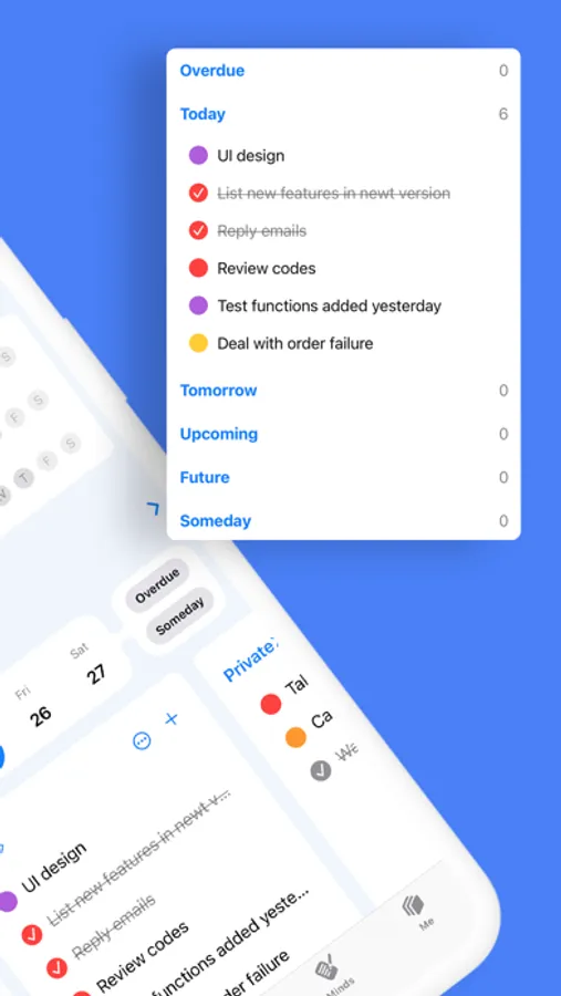 What do you have to do today / tomorrow / todos? Using task type, you can put different tasks in different types. Suddenly think of a recent thing to do? With "Do it later", you can store them temporarily and deal with them later.