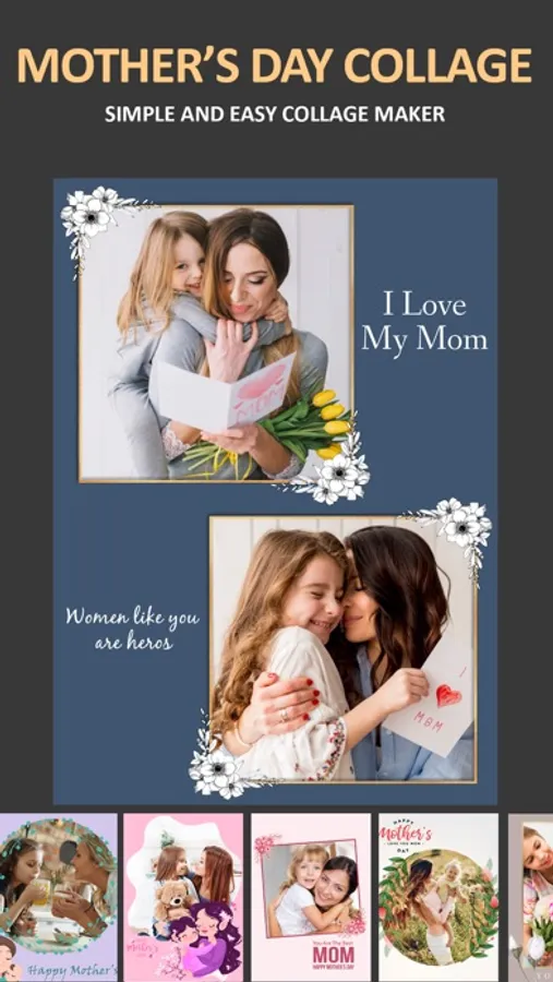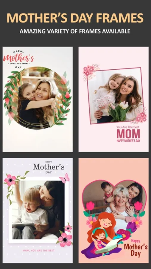 Mothers' Day Photo Frames is a collection of many lovely photo frames for you to decorating your lovely photos. It has the same function as the Love Photo Frames, Birthday Photo Frames and other apps.