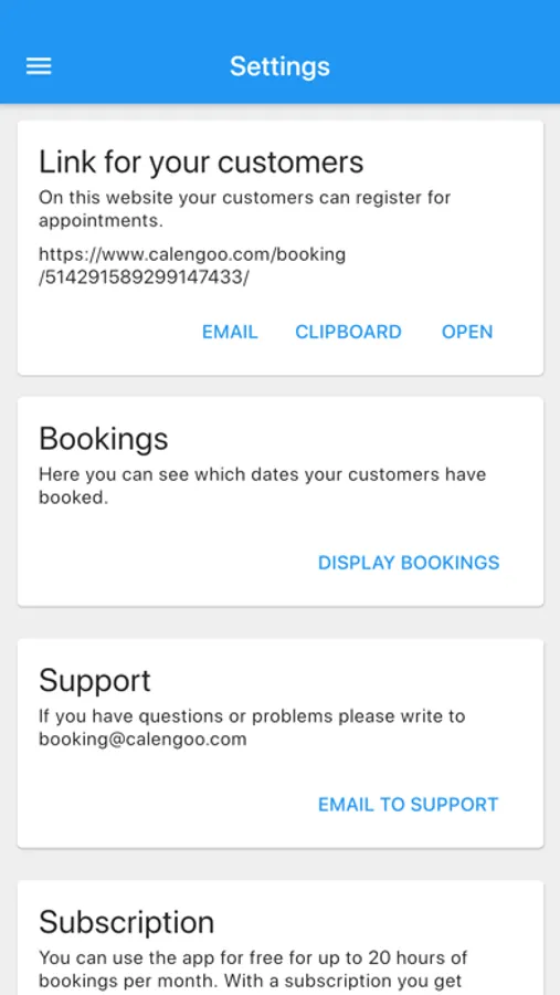 You can use this app for free for booking up to 20 hours per month. If you would like to have an unlimited number of bookings each month, you can subscribe:
