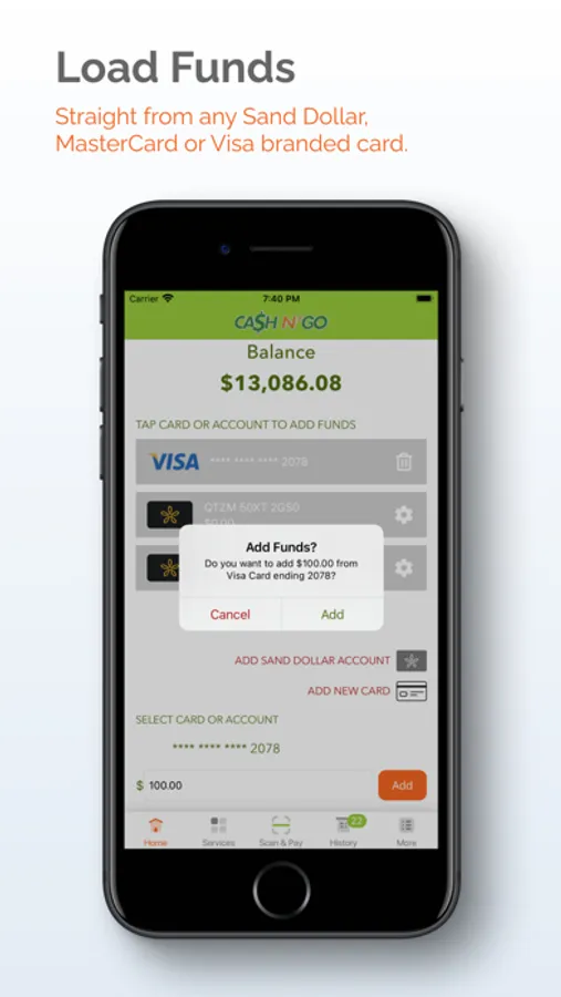 Loading Funds on your eWallet: Our app can be easily loaded with funds by stopping in to any Cash N' Go location and deposit cash into your eWallet - it is instantaneous! Or if you prefer you can attach your bank card to the app and load funds straight from any MasterCard or Visa branded cards - as simple as that!