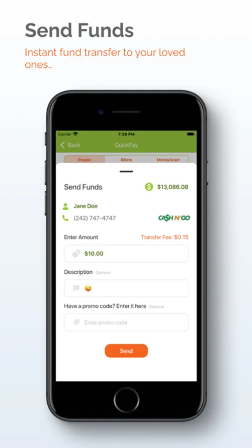 Transferring Funds to Others: Simply enter the phone number of any Cash N’ Go mobile wallet user, enter the amount you would like to transfer to them & hit transfer and the funds are instantly transferred - no waiting around!