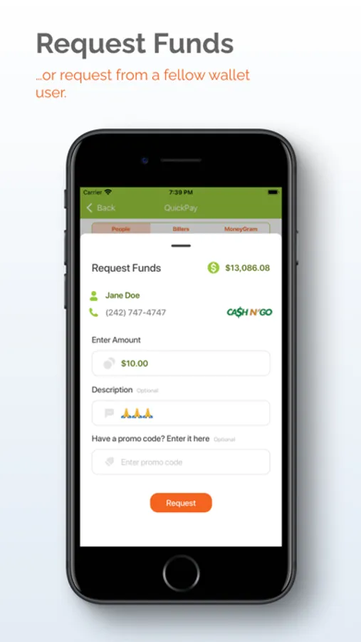 Request Funds from another Cash N’GO mobile wallet user: Simply type in their mobile phone number and hit request funds - the user will get a request and either accept or decline - as simple as that!