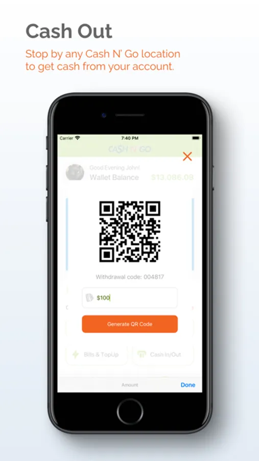 Get Cash Out: Simply stop by any Cash N'Go location and go to the cashier to get cash out of your account. All you need to do is provide the secure one time withdrawal code in your app- safe and simple as that!