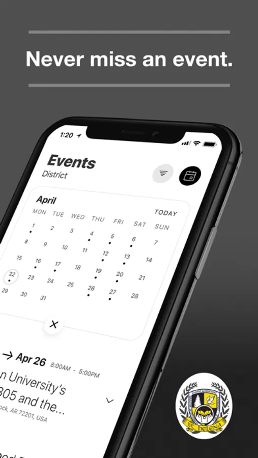 The event section shows a list of events throughout the district. Users can add an event to your calendar to share the event with friends and family with one tap.