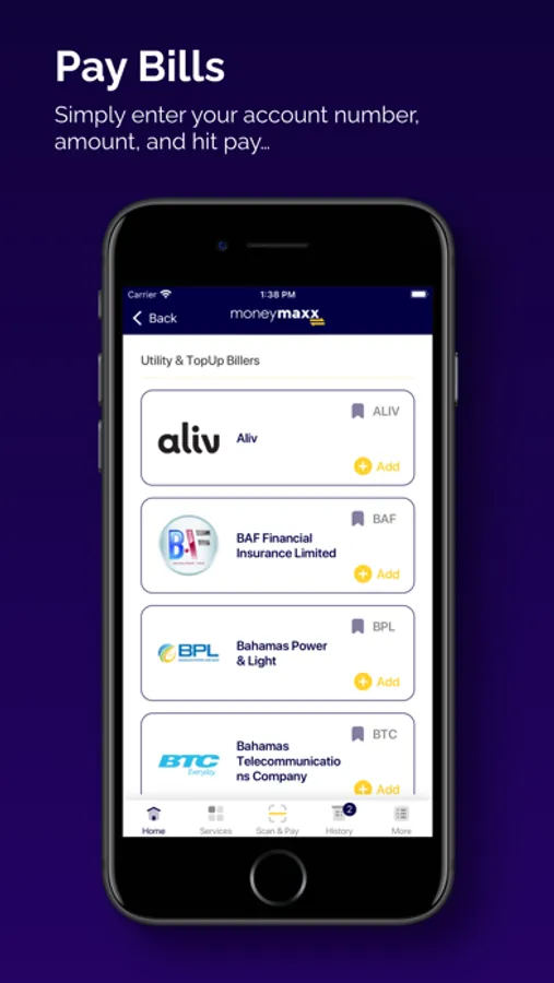 MoneyMaxx mobile wallet is an app designed to facilitate person-to-person transfers as well as payments to businesses where our mobile wallet credit is accepted. MoneyMaxx mobile wallet allows you to pay utility bills from anywhere with confirmation directly in app. You can use MoneyMaxx at participating businesses and with individuals who have the wallet anywhere in The Bahamas. MoneyMaxx - helping you make your dollars do more!