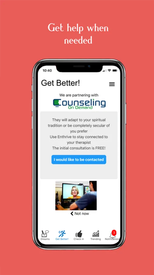 The Enthrive app is free to download and use. There are no in-app purchases. It can be used in conjunction with services from Counseling on Demand. Learn more by tapping the Get Better! icon and then Connect. They offer a free initial consultation.