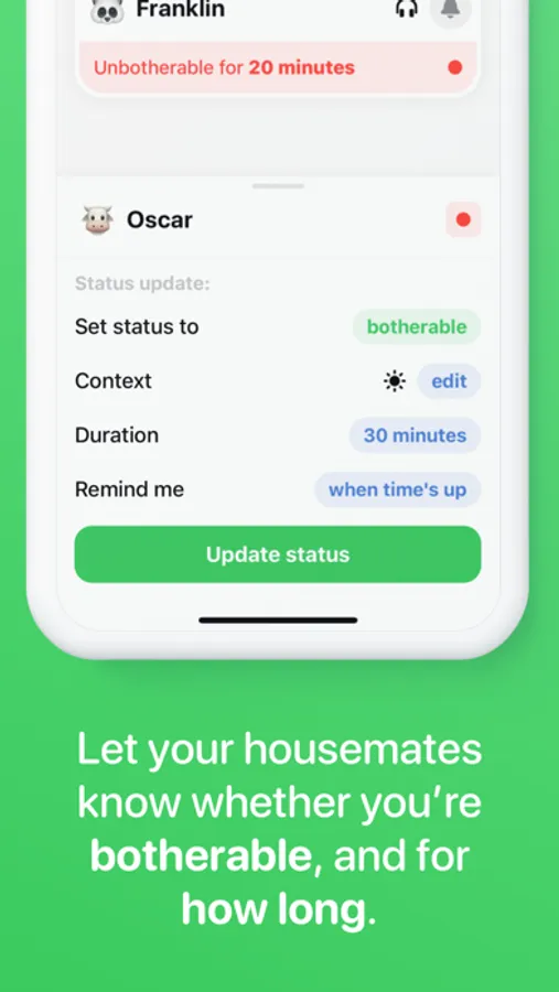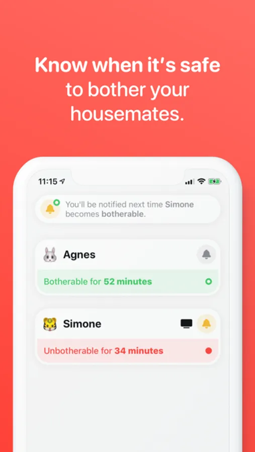 • Set notifications to let you know when a housemate's status changes, and time your distractions accordingly!