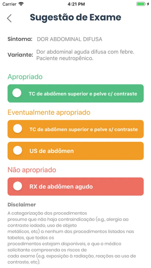 4. Pronto, você terá o resultado de quais modalidades de imagem são mais adequadas para seu paciente.
