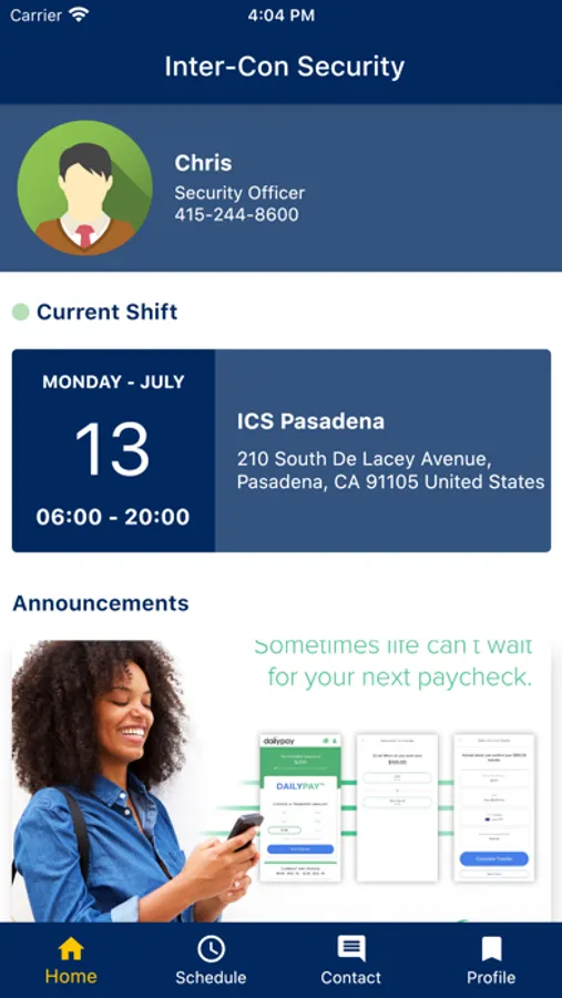 The Inter-Con Security mobile application provides our officers with an easy to use solution to receive company and schedule information, as well as create timesheets for all their assigned activities. Additionally, the solution provides quick access to employee benefits and resources to help the officers immediately when they need it.
