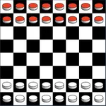 The 8x8 board is initially set up with the two front rows filled by white piece and the two back rows filled with red pieces.