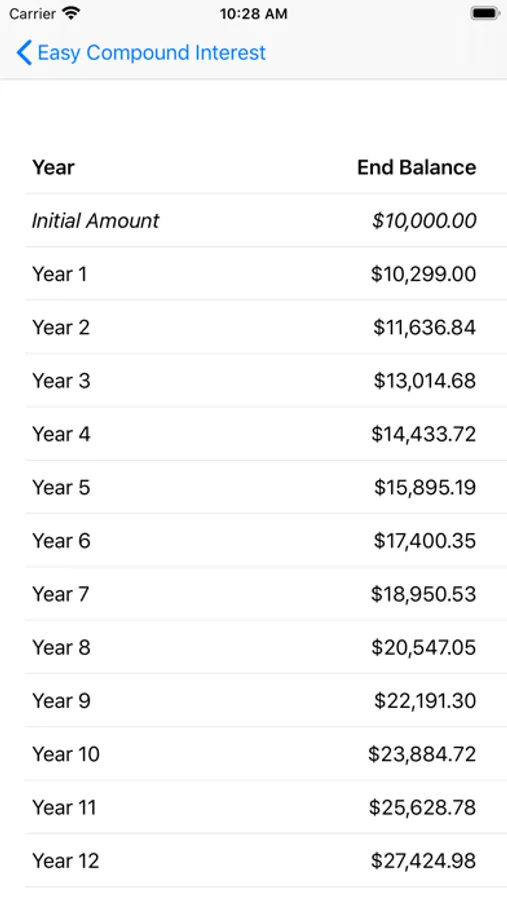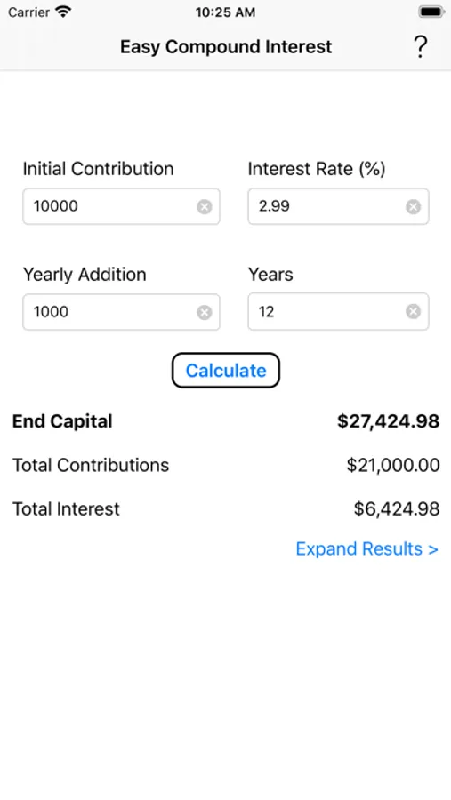 Easily calculate the compound interest on your savings. Includes the ability to specify an annual addition. After calculation, you can see the results as a table, showing the end balance of each year.