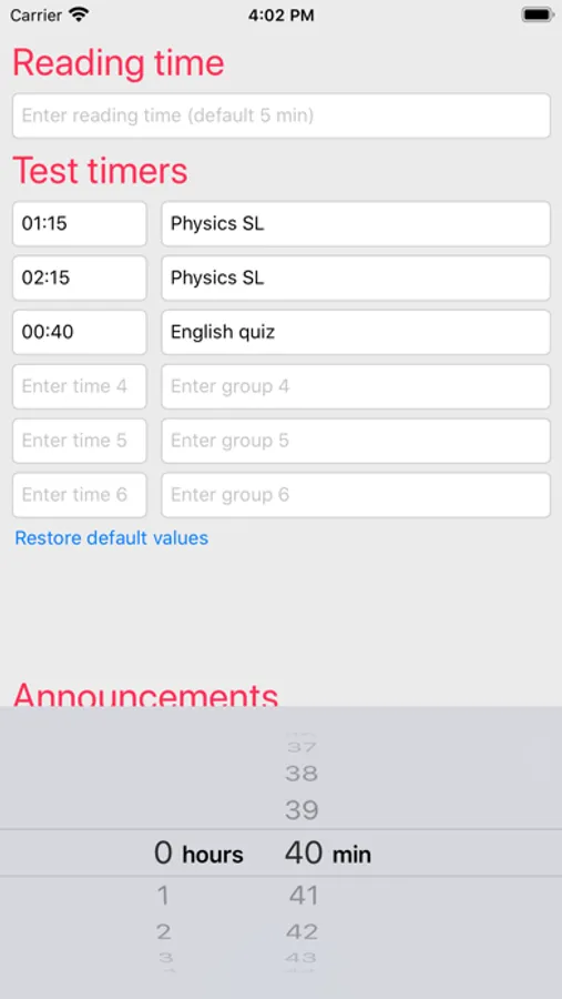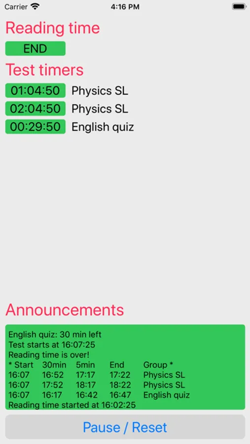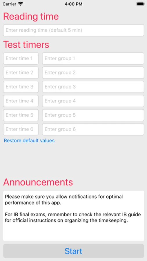 A simple app to help you time any test, quiz or exam following the typical IB (International Baccalaureate) standard with separate reading time. You can time up to six six different groups in parallel.