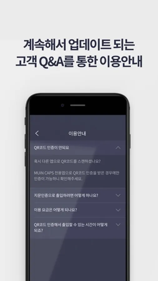 어플리케이션 QR코드 인증으로 누구나 편리하게 출입이 가능하며, 전국 어디서나 무인캡스 가맹점이라면 단 1회 인증으로 손쉽고 빠르게 출입하실 수 있습니다.