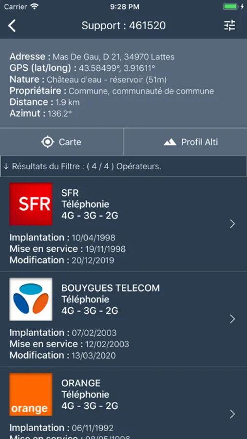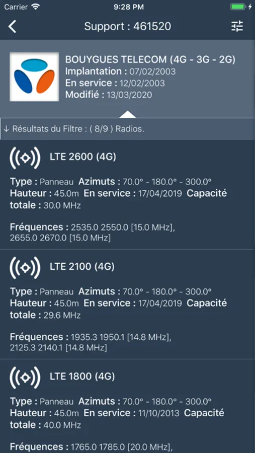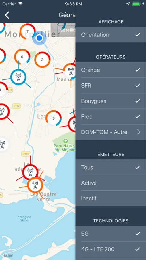 GéoRadios te permet de GéoLocaliser avec précision les antennes et réseaux téléphoniques mobiles 5G, 4G, 3G à proximité en France et dans les Dom-Tom.