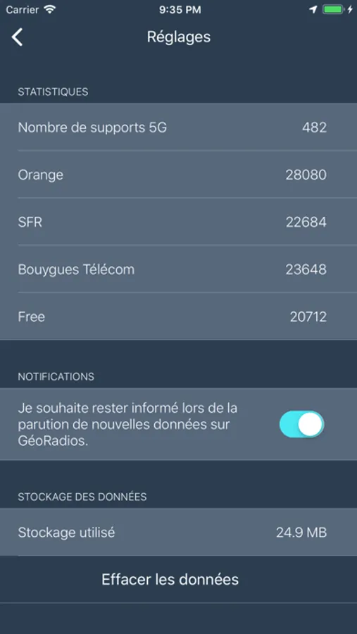 GéoRadios peut fonctionner exclusivement en mode hors-ligne, le fichier complet des supports radios est téléchargé en amont et stocké localement, ce qui peut être utile lorsque la couverture Internet n’est pas disponible.