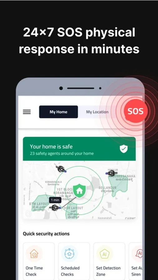 - 3 min SOS emergency assistance - Guaranteed phone call within seconds and a certified security guard within 3 mins during distress or emergency for your personal assistance. Your personal safety or home security is never compromised. Our network of security guards patrol 24x7 to protect you no matter your situation be it a medical emergency, stalking, eve-teasing, burglary, theft etc.