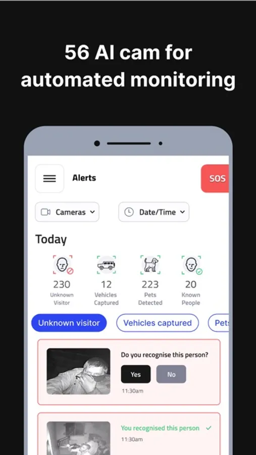 - Intelligent daily reports - Through advanced facial recognition our AI security camera surveillance can detect a known person, unknown person, pet or vehicle and share summary reports by date and camera location.