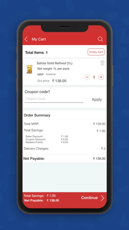 - Daily grocery & staples like Flours, Grains, Rice, Dals, Masalas, Spices, Cooking Oil, Ghee & other daily need groceries.