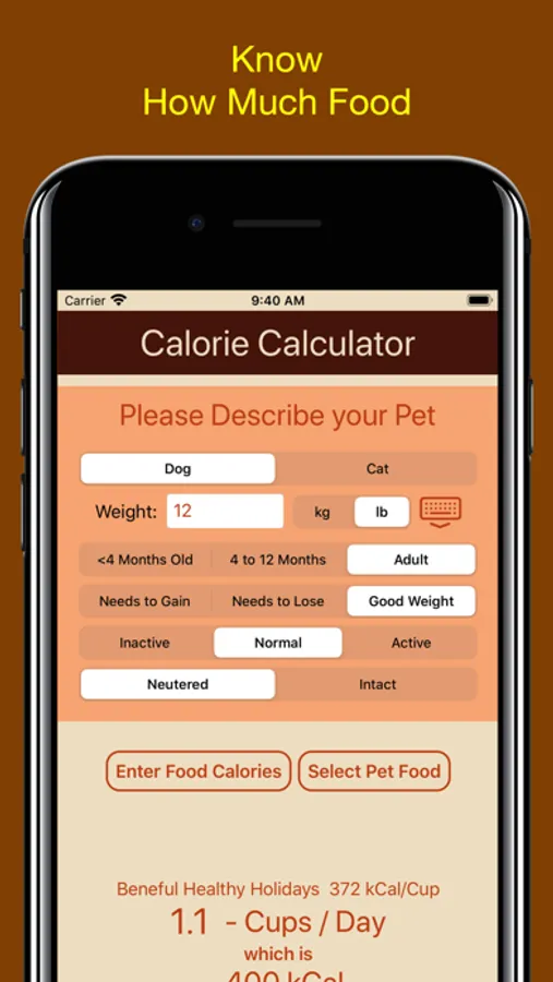 Answer a few questions about your pet, enter the kCalories for your pet's food and get an estimate of the right amount to feed them to maintain their current weight.