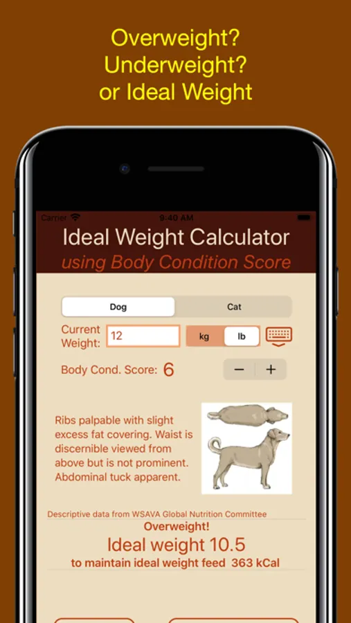 • Calculates ideal weight from BCS and current weight, uses the 1 to 9 BCS
