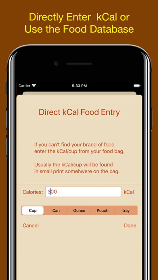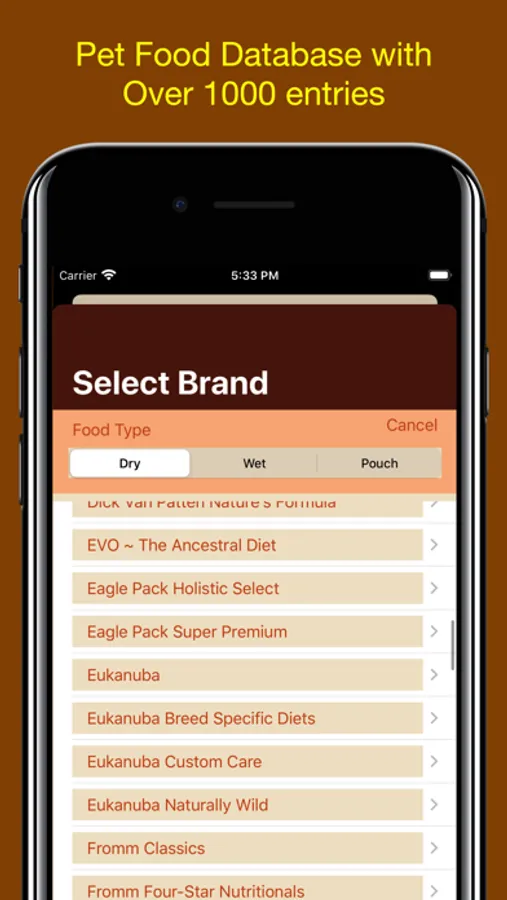 • Includes a Dog and Cat food database, with over 1000 entries for Dog and cat food.