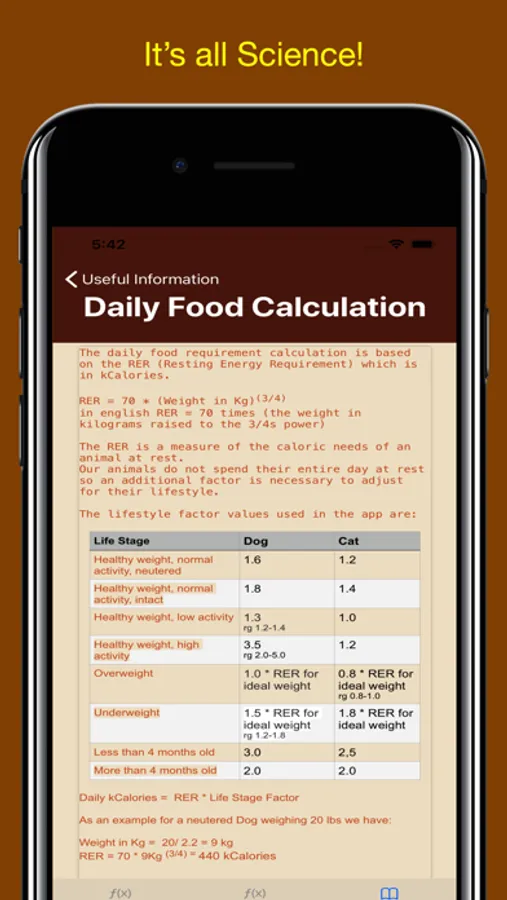 • Calculates daily kCalories using the Resting Energy Requirements (RER) formula