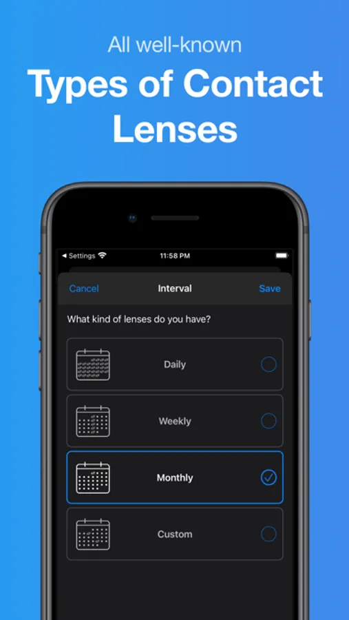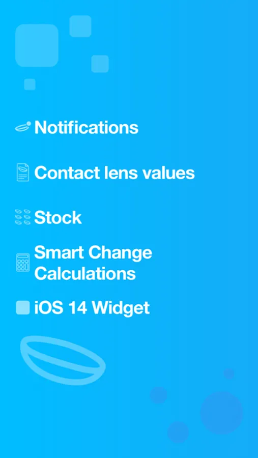 You simply enter the kind of lenses you wear and when you started wearing them. Then, Lensy calculates your change date. When the date is reached, Lensy calculates your new change date and also reduced the number of remaining lenses.