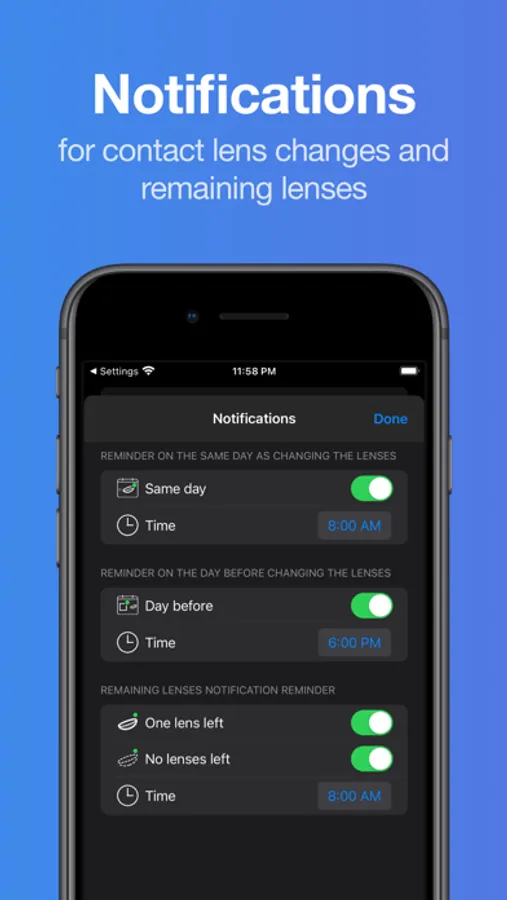 Lensy can send notifications to remind you about changing your lenses.