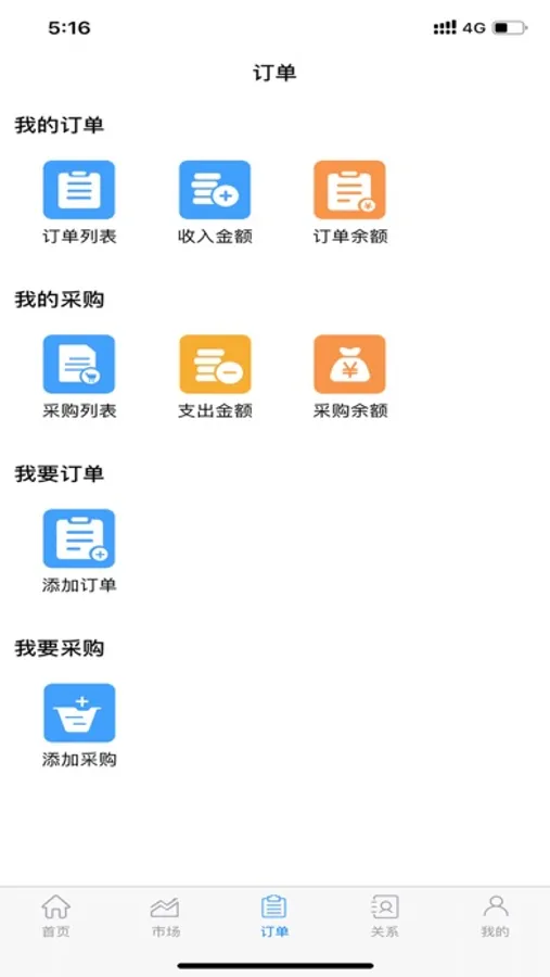 主要功能:我的订单(订单列表、收入金额、订单余额)、我的采购(采购列表、支出金额、采购余额)、我要订单(添加订单)、我要采购(添加采购)等。