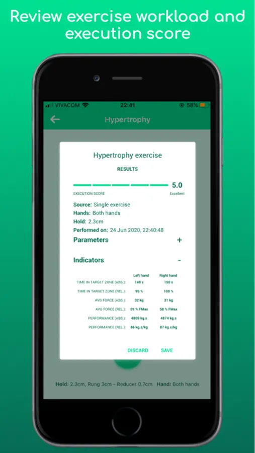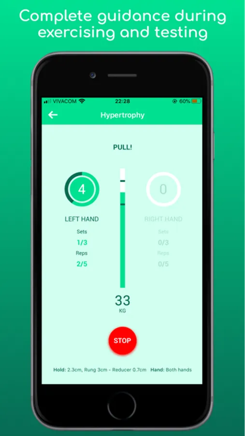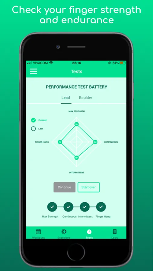 The tests provide quantitative measures of finger strength and endurance as well as local muscle aerobic and anaerobic capacity. These measures are transformed into scores and presented as climbing grades for climbers’ convenience. The app presents the test results in a Radar chart so you can easily find out what are your weak and strong points. You can also compare the results of your last two completed test batteries to check your progress. The app provides complete information on how the tests have to be performed and guides you during test execution.