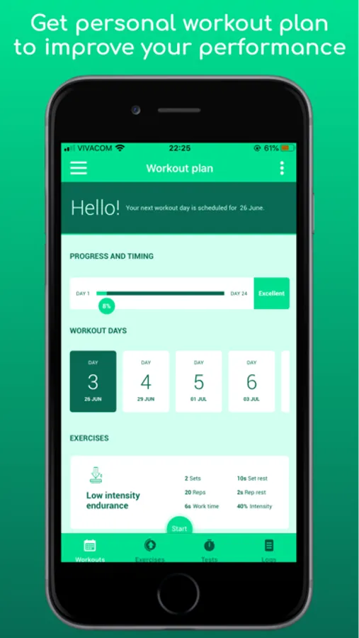 The Climbro app provides 5 predefined exercises with various parameters to improve different physical qualities: