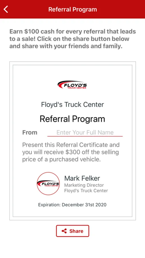 Floyd's Truck Center dealership loyalty app provides customers with an enhanced user experience. The mobile dealership app provide customers with relevant specials and loyalty offers. Key features include: