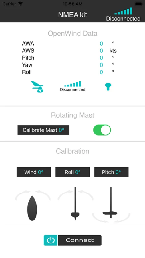 This application works only with NMEAkit device. The app can calibrate Wind, Pitch and Roll from OpenWind and if the NMEAkit unit contains a compass, you can use the rotating mast option: