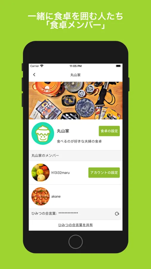 食卓ラボでは家族・パートナー・友人など、一緒に食卓を囲む人たちと共通のアカウントを使います。「○○家」や「○○シェアハウス」など、あなたの食卓に名前をつけてみましょう!