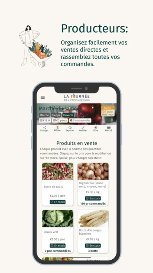 Vous êtes producteurs ? Grâce à cette plateforme, vous vous facilitez la prise de commande et vous pouvez organiser des tournées de livraison, des ventes en dépôts, des points de collecte ou des petits marchés avec vos amis producteurs. La Tournée des Producteurs n'est pas une market-place ou un site d'e-commerce. Pas besoin de gérer un catalogue de produits, vous organisez vos ventes quand, où et comme vous voulez.